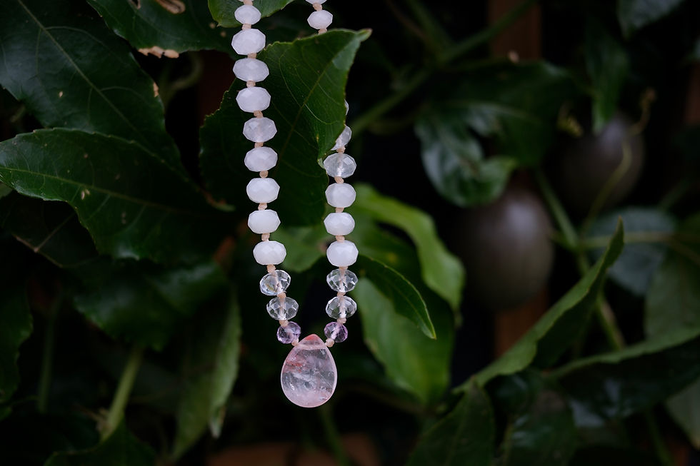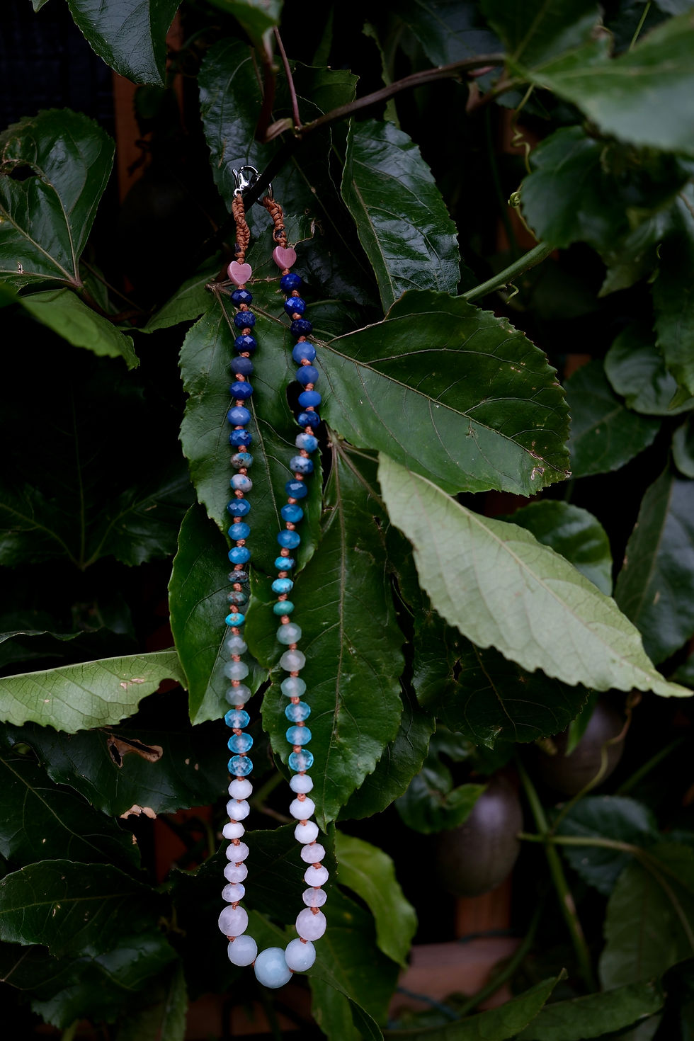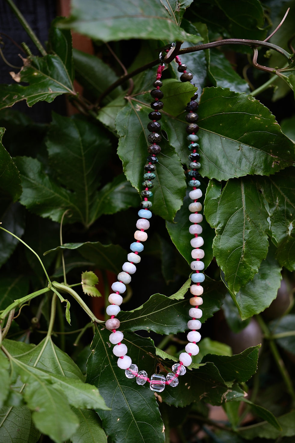 Peruvian amazonite, carnelian, red jasper, rhodonite, red agate, yellow jade, citrine, aquamarine, African turquoise, green banded agate, Peruvian turquoise, Brazilian amazonite, kambaba jasper, blue aventurine, lepidolite, amethyst, rose quartz, tiffany jasper, and last but not least, white sunstone. Whew!